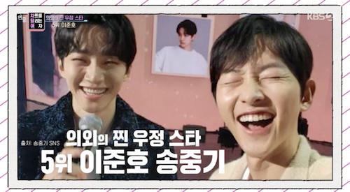 そして5位は2PMジュノとソン・ジュンギだった。2人はデビュー当初、スポーツバラエティ『出発!ドリームチーム』での共演をきっかけに13年間友情を深めた。ジュノはソン・ジュンギに演技のアドバイスを求めたり、初めての車をソン・ジュンギと同じ車種にしたりして話題を集めた。