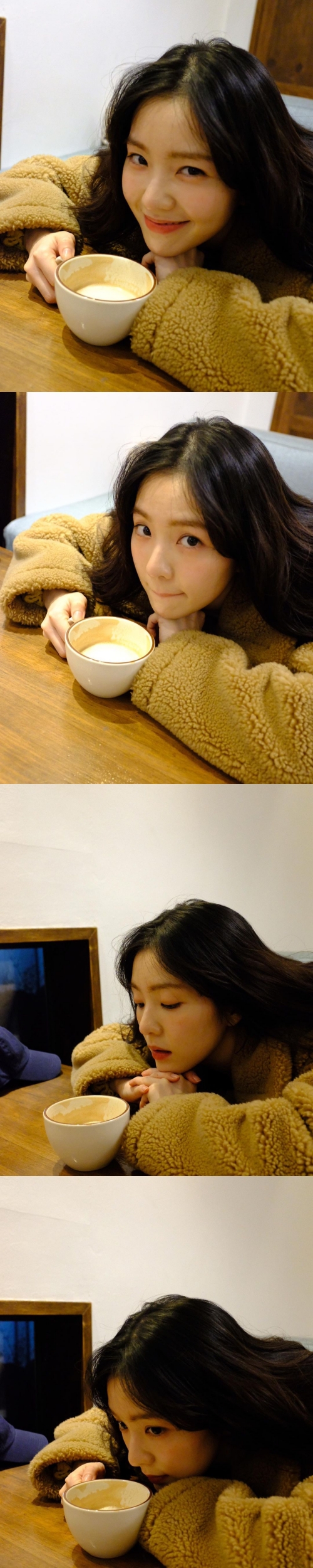 写真には、ミルクティーを片手に上目遣いでこちらを見つめるアイリーンの姿が写っている。