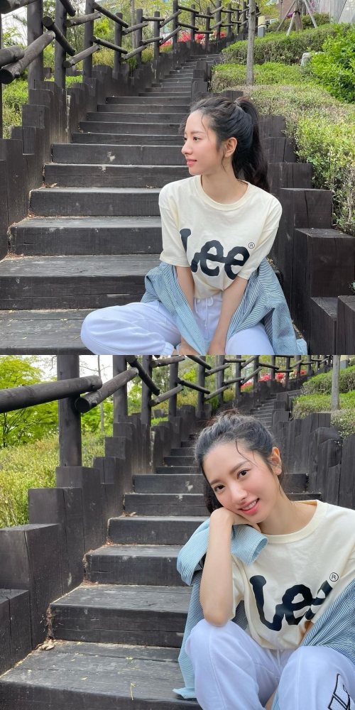 写真には、屋外の階段に腰掛けながら、こちらを見つめるボナの姿が。微かに汗ばんだ額や、赤らんだ頬から運動中であることがうかがえる。
