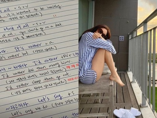 公開された写真でヒョミンは、英語の勉強にすっかりハマっている様子で、ペンの色を変えながら筆記に熱中している。様々な文章をノートに書いているのだが、そのなかに「彼と結婚するのなら、むしろ死ぬよ」という一文があり、目を引いた。