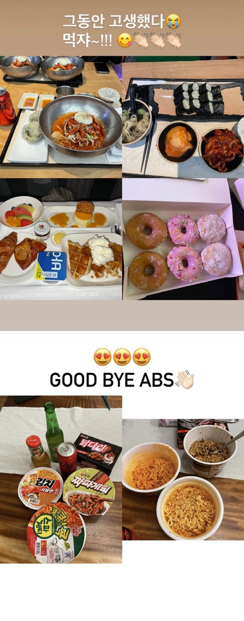 その後、パク・サンダラは「これまで苦労した。食べよう!」「GOOD BYE ABS(さようなら腹筋よ)」とし、小麦粉と炭水化物たっぷりの食べ物の写真を投稿し、自分の体を労っていた。