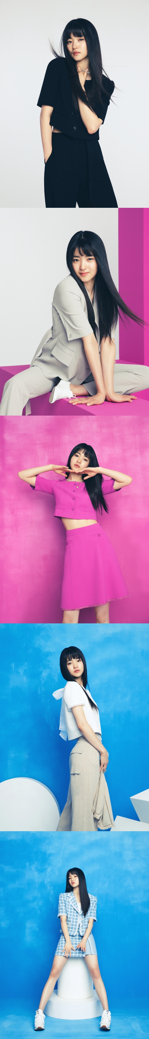 アイスグレーのテーラードジャケットやカラフルなセットアップなど、春夏コレクションのアイテムを次々と着こなすキム・テリは、どのようなアイテムも持ち前の魅力で似合ってしまうポテンシャルの高さで見る者を驚かせた。