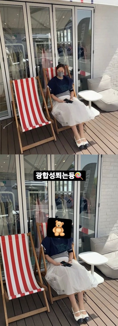 Tシャツとスカートというカジュアルスタイルのファン・ジョンウムは、日が差し込むテラスに座って余暇を満喫しており、最近出産したという事実が信じられないほどスリムな体つきが目を引く。