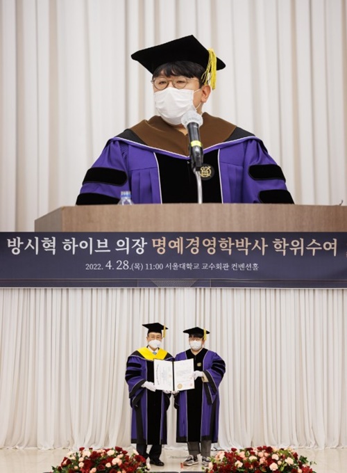 “BTS(防弾少年団)の生みの親”で知られるHYBEのパン・シヒョク議長に、ソウル大学の経営学分野の名誉博士号が授与された。4月28日、大学内で授与式が行われた。