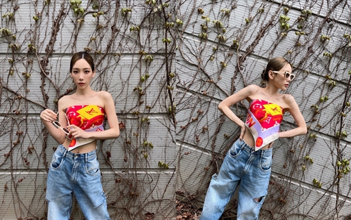 モデルのアイリーンもテヨン同様、ルイ・ヴィトンのスカーフをトップス代わりに着用。ブラックデニムに白のシャツを羽織り、スリムな体つきを存分に生かしている。
