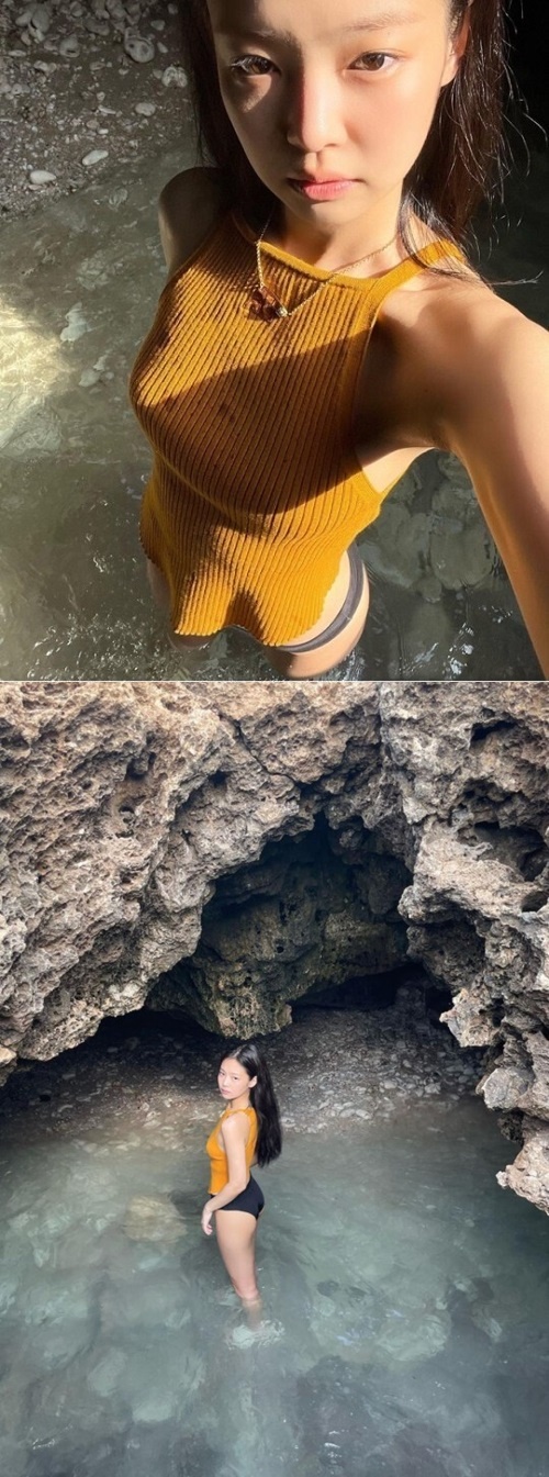 公開された写真のジェニーは、洞窟のような場所でスイムウェアを身につけてカメラを見つめている。無駄な肉が一切ない、引き締まったスタイルが視線を奪った。