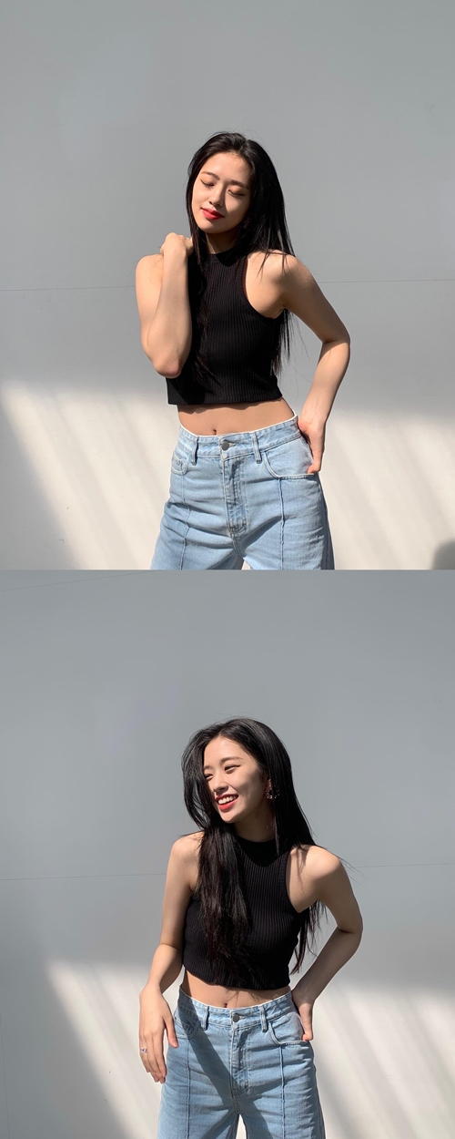 写真のユジンは、無機質な空間で撮影中のようだ。春の日差しが降り注ぎ、ユジンは爽やかな笑顔を見せている。クロップドトップスからはスリムなお腹が見えており、普段からの節制が感じられる。