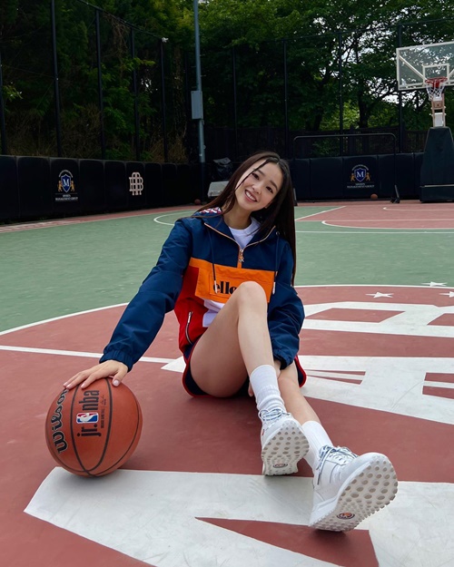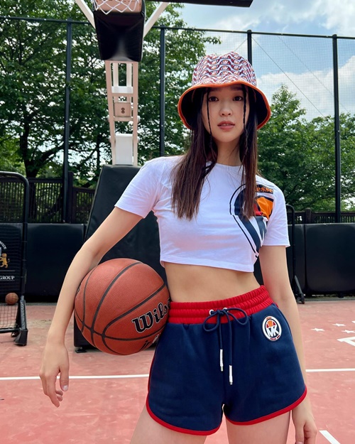 写真を見ると、クロップド丈のトップスにミニ丈のショートパンツを合わせたコーディネートのソン・ヨンジェが、バスケコート上で可愛らしいポーズを取っている。