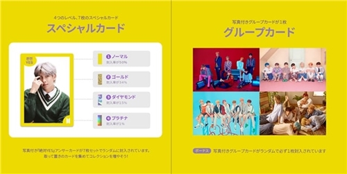 回答を予想するのに使うアンサーカードには、BTSメンバーのこれまでの活躍をまとめたフォトカードが付いたスペシャルアンサーカードがある。ノーマル、ゴールド、ダイヤモンド、プラチナと全部で4種類のカラーがあり、いずれか1種が封入されている。