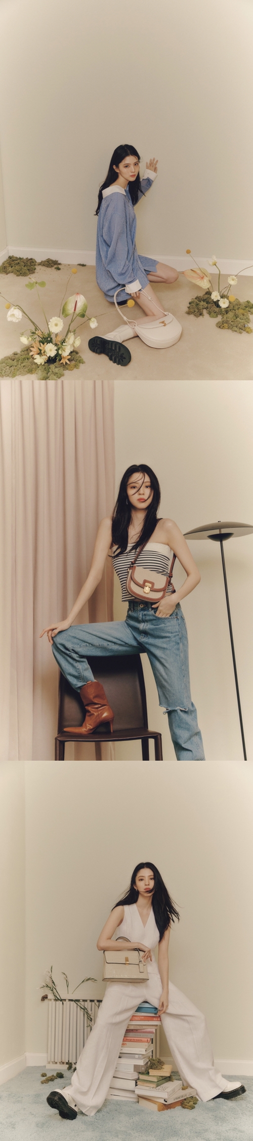 ハン・ソヒは涼しげなブルーのストライプシャツや真っ白なセットアップにホワイトカラーのバックを合わせ、清涼なスタイリングを施している。デニムセットアップやスーツを着て、ハン・ソヒ特有のモダンでシックな洗練された姿も披露した。