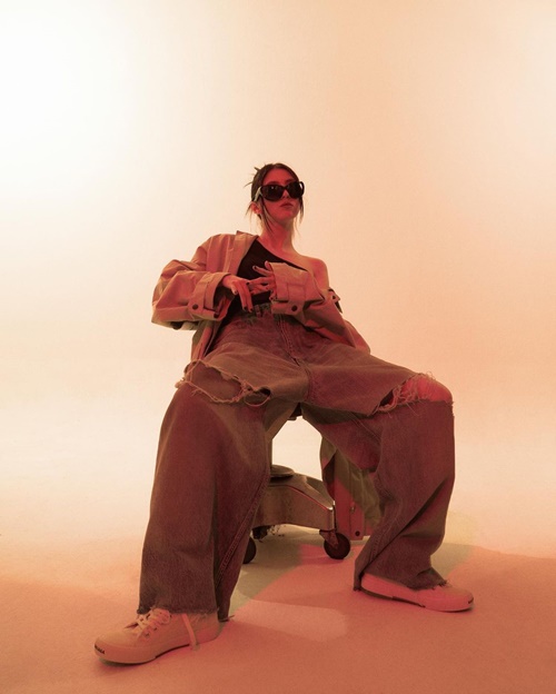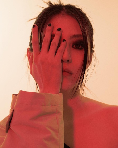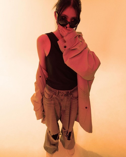 写真を見ると、黒のワンショルダータンクトップにオーバーサイズのコートを合わせたハン・ソヒが、カメラに向かって多彩なポーズを披露している。