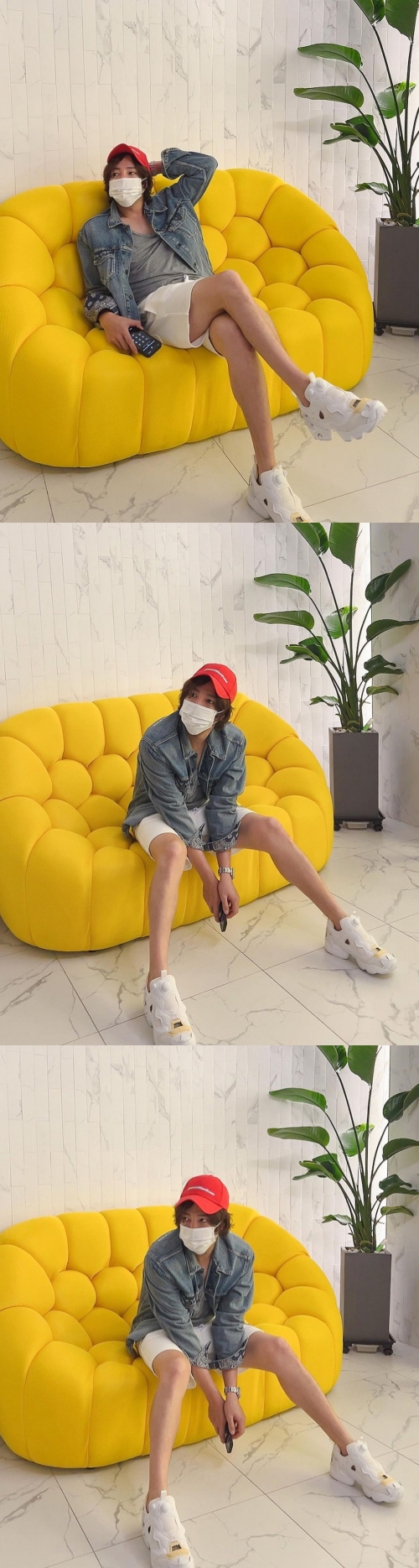 赤いキャップにハーフパンツ、デニムジャケットを羽織ったリラックスモードのチャン・グンソク。マスクをしていても隠せないハンサムなビジュアルを見せつけている。