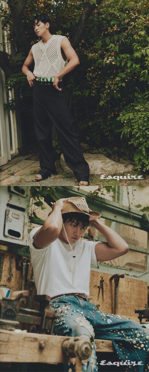 ファッション誌『Esquire Korea』が公開した写真には、アロハシャツやタンクトップ、ビジュー付きのジーンズなど個性的なアイテムを着こなしたチ・チャンウクの姿が写っている。