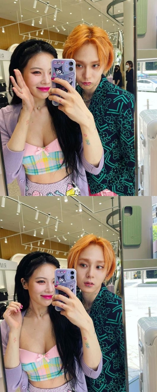 公開された写真は、2人が、とあるお店に訪問し、鏡の前で自撮りをしている様子が映っている。ヒョナの果敢なファッションと、イドンのオレンジカラーのヘアスタイルが目を引く。2人はカラフルなコーデで、周囲の目を意識しない堂々とした姿でデートを楽しんだようだ。