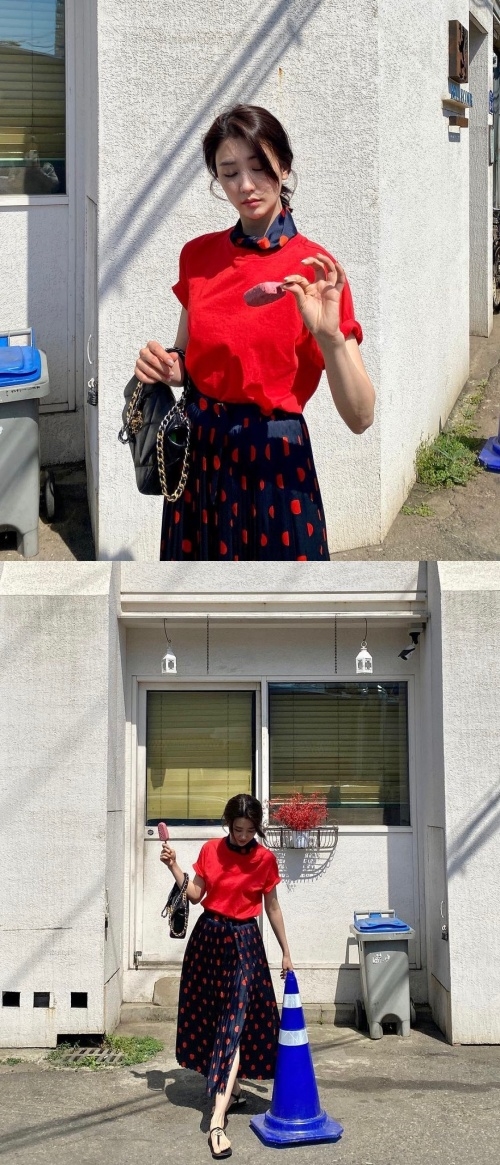 公開された写真のパク・ハソンは、街頭でアイスを持って立っている。鮮烈な赤とネイビーのツートーンコーデで洗練されたファッションセンスを披露したパク・ハソンは、シャネルのバッグでラグジュアリーさを加えた。