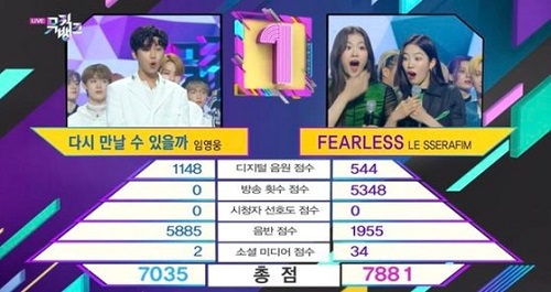 同番組の1位は「デジタル音源」「放送回数」「視聴者好感度」「音盤」「ソーシャルメディア」の5項目の点数の総合で決まるのだが、イム・ヨンウンの「放送回数」の点数が0点で、LE SSERAFIMが総合1位に輝いた。