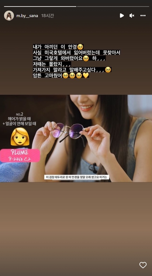5月31日、サナはインスタグラムのストーリーで「私が大事にしていたこのメガネ。実はアメリカのホテルで失くしてしまったのですが、見つからなかったのでそのまま来てしまいました」と伝えた。