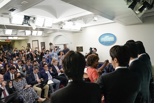 記者室に設けられた指定席はもちろん、その隣の空間まで海外メディアの記者100人余りであふれ、足の踏み場もないほどぎっしりと埋まった。普段の3倍以上の人員だ。ドナルド・トランプ政権の時からホワイトハウスを出入りしてきたというアメリカ記者は、「バイデン政権に入ってブリーフィングルームにこんなに多くの記者が集まった記憶がない」と話した。