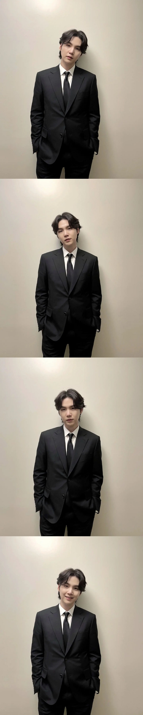 SUGAはオールブラックスーツで大人の色香漂う姿を披露。両手をポケットに入れたまま、黒髪はセンターパートでシックな雰囲気だ。