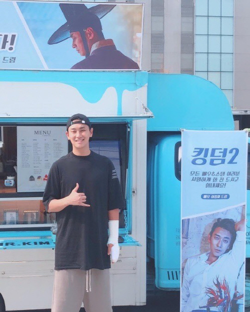 公開された写真には、俳優イ・ジョンジェが撮影現場に贈った軽食ワゴンの前でポーズをとるチュ・ジフンが写っている。チュ・ジフンの片手にはギプスらしきものが嵌められており、写真を見たファンからは心配の声が尽きなかった。