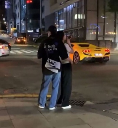 公開された写真では、キム・ドンヒョンと思われる男性が女性の後ろに立ち、腰に手を回している。女性も男性に寄りかかっているように見える。