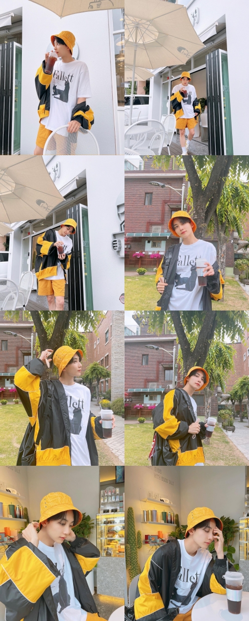 黄色で統一したバケットハットにハーフパンツを着用した姿で何やらご機嫌のジョンハン。ステージで見せるクールな姿とは対照的なあどけない横顔が印象的だ。