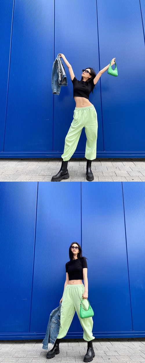 写真のナナは、黒いクロップドTシャツにミント色のズボンを合わせ、多彩なポーズを取っている。鮮やかなグリーンのハンドバッグでコーディネートにアクセントを加え、格別なファッションセンスを見せている。