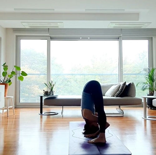 公開された映像には、リビングでヨガをしているキム・ジホが映っている。キム・ジホはボディラインが見えるウェアを着用し、マット上でトレーニングをしている。驚くべきは、その柔らかさだ。まるでフィーチャーフォン、いわゆるガラケーを折り畳んだ状態にまで体を曲げている。