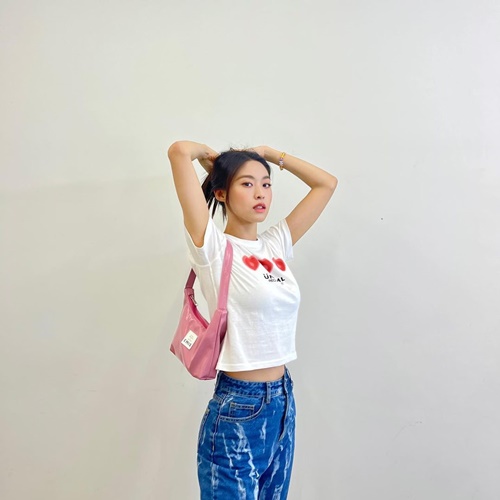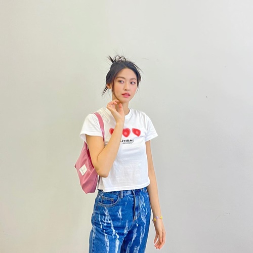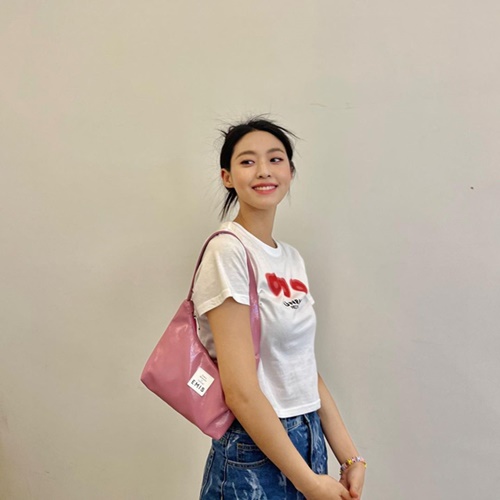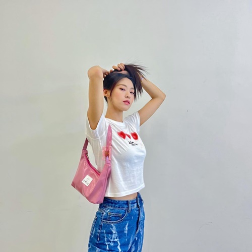 写真を見ると、ジーンズに白のTシャツを合わせたコーディネートのソリョンが、ピンクのショルダーバッグを肩にかけ、こちらを見つめている。