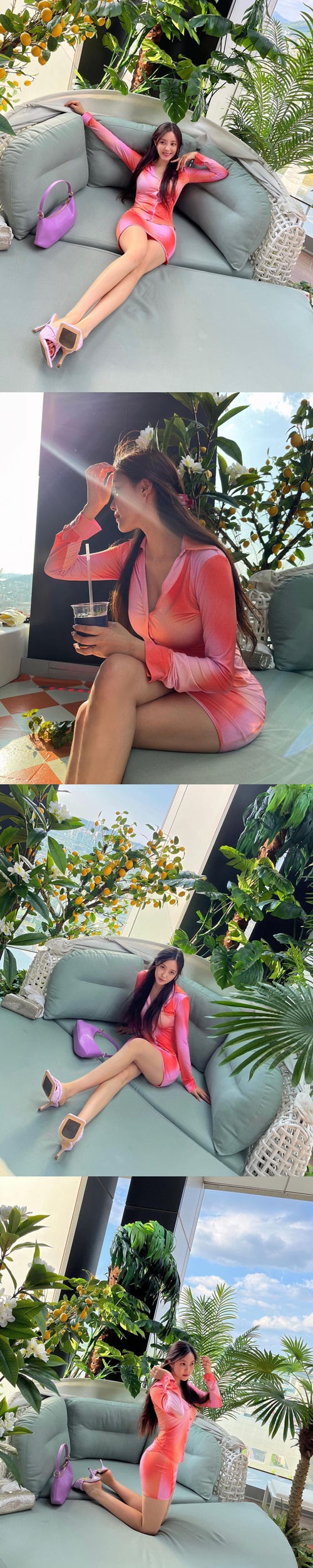 写真を見ると、鮮やかなピンクのシャツに同色のミニスカートを合わせたコーディネートのヒョミンが、ソファーの上でさまざまなポーズを披露している。タイト目なシャツから伝わる引き締まったスタイルはもちろんのこと、ミニスカートからスラリと伸びた美脚が見る者の目を引いた。