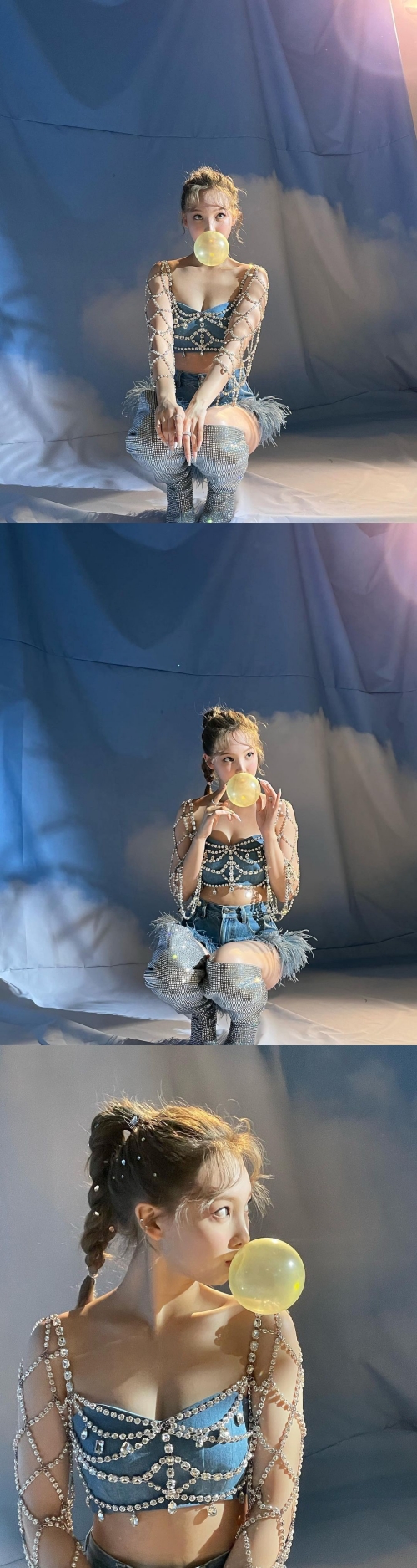 ナヨンは、デニム素材のチューブトップにビジューが連なったボディーチェーンを着けたゴージャスな装い。高い位置の三つ編みにも、ラインストーンが輝いている。