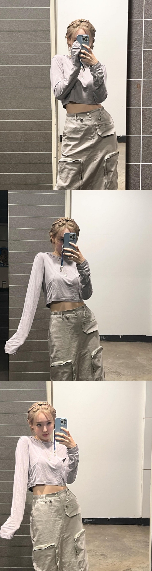 ナヨンは編み込まれたヘアスタイルに、クロップドTシャツ、カーゴパンツを合わせたシックなスタイリングだ。Tシャツから覗くスリムなウエストが見る者を魅了した。