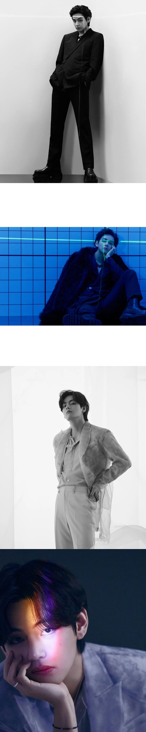 公開された写真のVは、黒のセットアップを着用し、髪をアップした男の色気あふれるワイルドなスタイルだ。特徴的なライトが照射された空間で、ノワール映画のマフィアのような雰囲気を醸し出している。