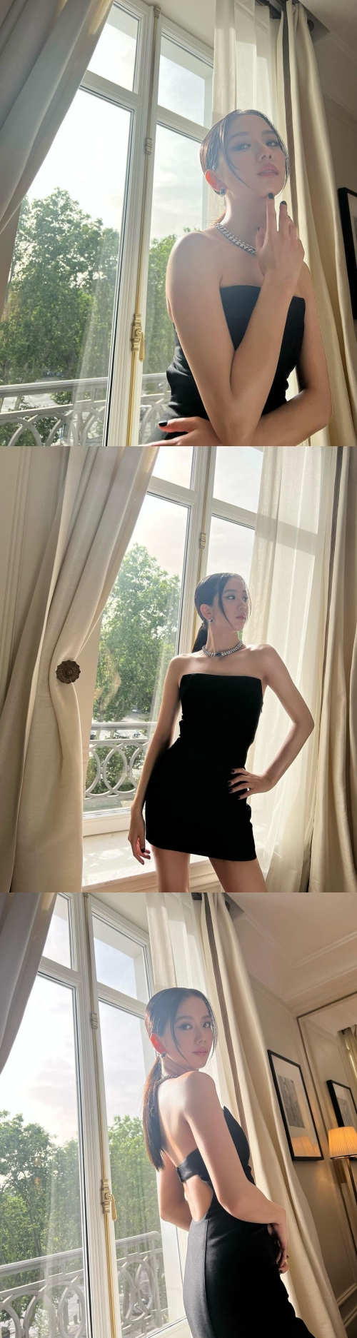 別の写真には、窓際でたたずみながら、こちらを見下ろすジスの姿が写っている。普段から清純でキュートなイメージが多いだけに、今回の大人っぽいドレス姿が反響を呼んでいる。