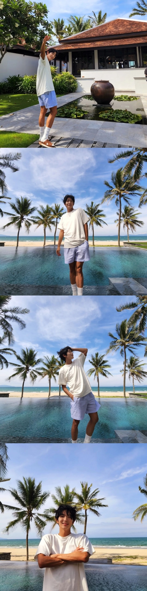 イ・ジュンギはTシャツにハーフパンツに着用した涼しげなスタイリングで、小麦色の引き締まった身体が印象的だ。