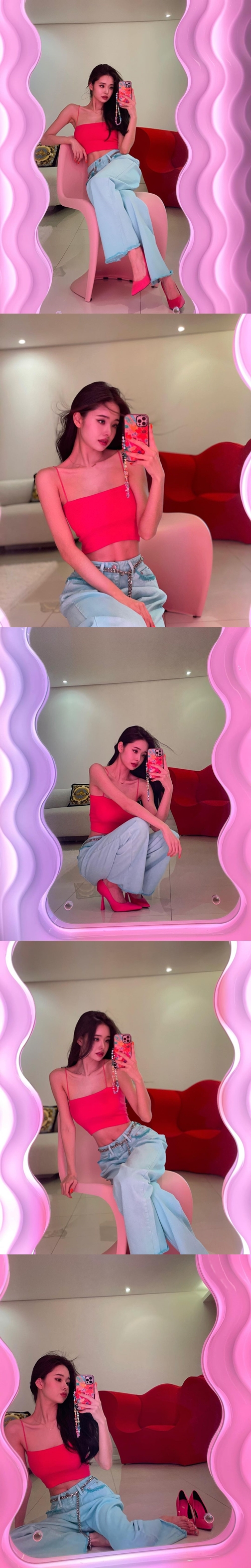 公開された写真には、ホットピンク色のクロップドTシャツにデニムを合わせ、鏡の前で自撮りをするソン・ジアが写っている。細すぎる肩とデコルテ、パキっとした腹筋で、騒動前と変わらない圧巻のスタイルを誇示した。