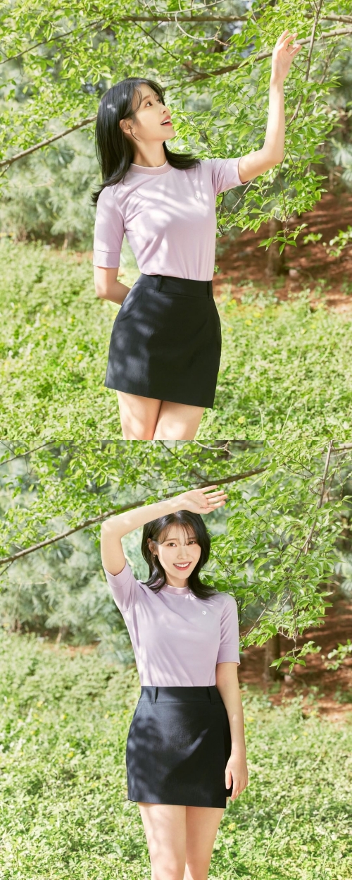 ポロシャツやショートパンツ、スカートなどのベーシックなアイテムをしっかりと着こなすIU。自然を楽しみながら爽やかな魅力を誇っている。