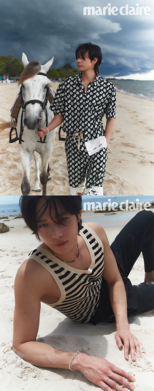 写真にはペイズリー柄のセットアップを着て、白い馬と共に青い海辺を歩くキム・ヨンデが写っていて、キム・ヨンデだからこそ似合うこのシチュエーションに感嘆させる。