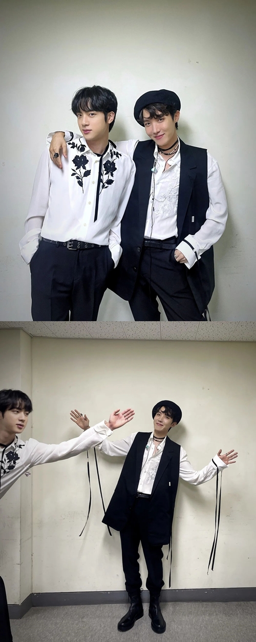 公開された写真には、J-HOPEとJINが仲良く肩を組んでいる姿が写っている。2人は黒と白のアーティスト然とした衣装で、洗練された雰囲気を醸し出している。