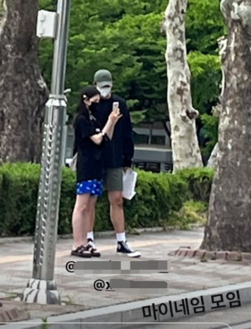 オンラインコミュニティに拡散された写真は、インスタグラムストーリーをキャプチャした写真だ。その写真には、帽子をかぶった男性と女性が路上で並んで立っており、甘い雰囲気を醸し出している。特に女性が黒の半袖Tシャツを、男性が黒のトレーナーを着用しており、“カップルルック”なのではないかとの見方もあった。