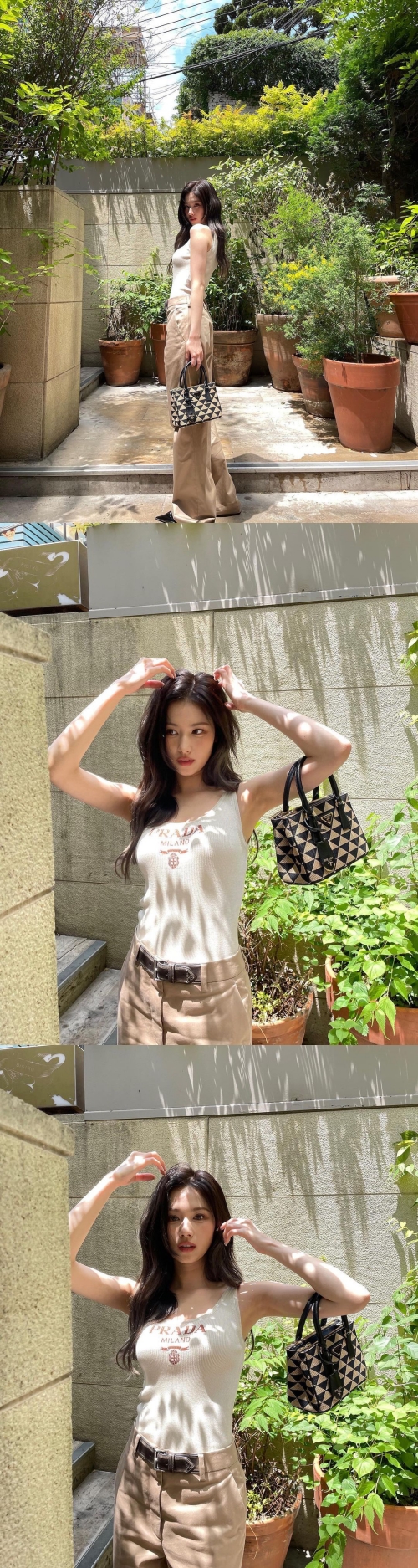 サナはタンクトップにパンツというシンプルな装い。バッグや靴をポイントにした洗練されたスタイリングを披露している。