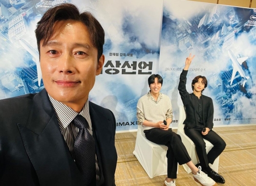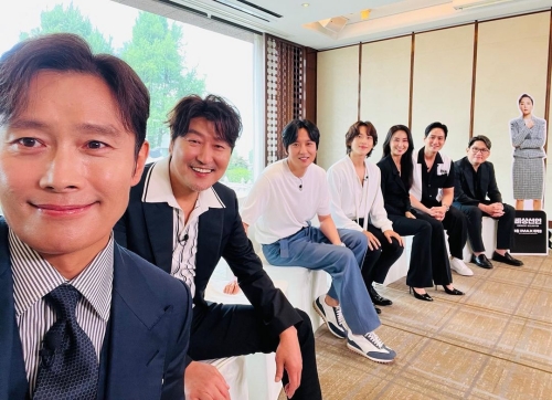 公開を控えている映画『非常宣言』(原題)のハッシュタグが添えられた写真には、イ・ビョンホン、ソン・ガンホ、キム・ナムギル、イム・シワン、キム・ソジン、パク・へジュン、ハン・ジェリム監督が肩を並べている。
