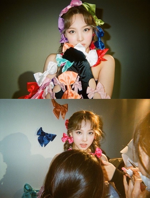写真には、こちらをじっと見つめるナヨンの姿が写っている。TWICEのメンバーカラーを思わせる9色のリボンを纏っている。