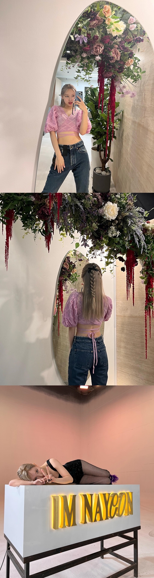続いて「D-1♡」という文でソロデビュー直前であることをアピール。ソロデビューアルバム名の「IM NAYEON」と書かれたセットの上に横たわっている姿も見せてくれた。