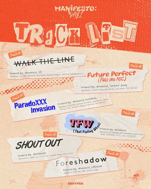 6月27日、ENHYPEN公式SNSで公開されたトラックリストによると、今回のアルバムにはリード曲『Future Perfect (Pass the MIC)』を含め、『WALK THE LINE』『ParadoXXX Invasion』『TFW (That Feeling When)』『SHOUT OUT』『Foreshadow』の計6曲が収録されるという。