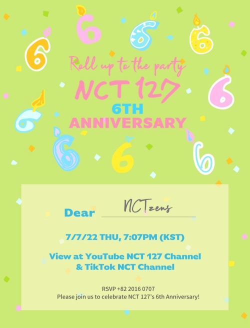 NCT127はデビュー記念日である7月7日に公式YouTubeチャンネル及びTikTokの公式NCTチャンネルを通じて、『Roll up to the party:NCT127 6TH ANNIVERSARY』を繰り広げる。