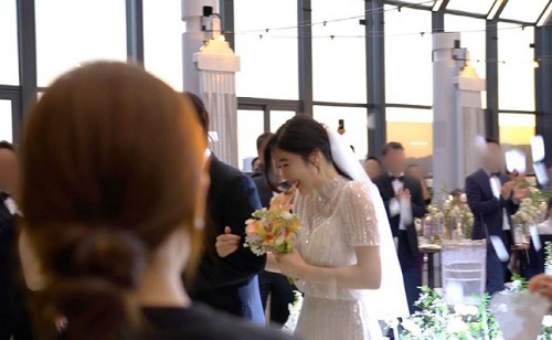 写真のイ・ヘリは、引き締まったウエストラインがあらわれるビーズのウエディングドレスを着て、ブーケを持ったまま笑顔を見せている。イ・ヘリは横にいる新郎の腕をしっかりと掴んでいた。