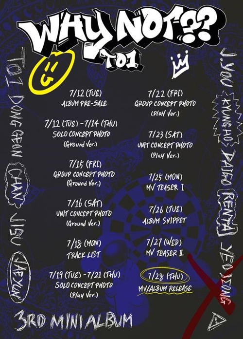 TO1のミニアルバム3集『WHY NOT ??』は7月28日18時、全てのオンライン音源サイトを通じて発売され、アルバムの予約販売は12日15時から全てのアルバムサイトを通じて開始される。