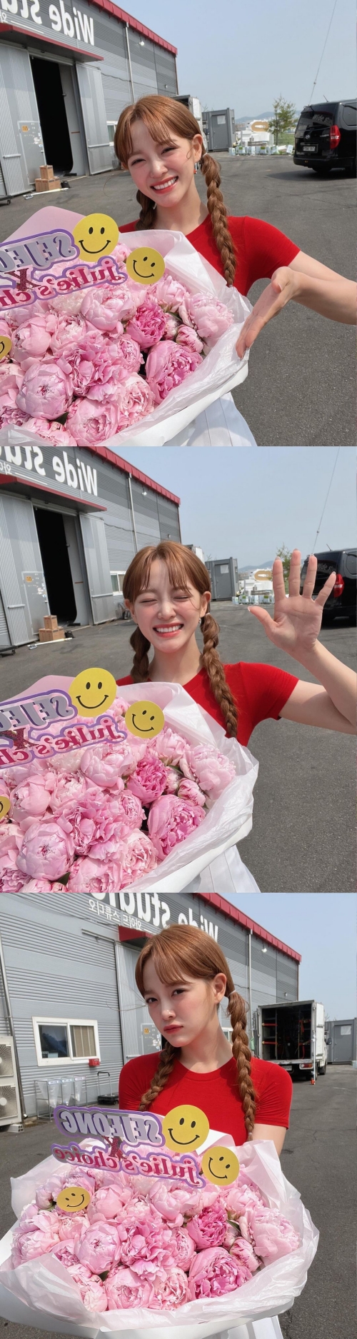 これは、広告撮影に臨んだ際のメイキングカットで、大きな花束を抱えながら笑みを浮かべるキム・セジョンの姿が写っている。