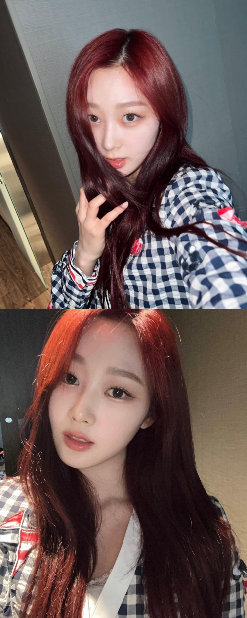写真には、自撮りをするGISELLEの姿が写っている。髪色はブラウンから鮮やかな赤に変化しており、愛らしい上目遣いで多くのファンを魅了した。